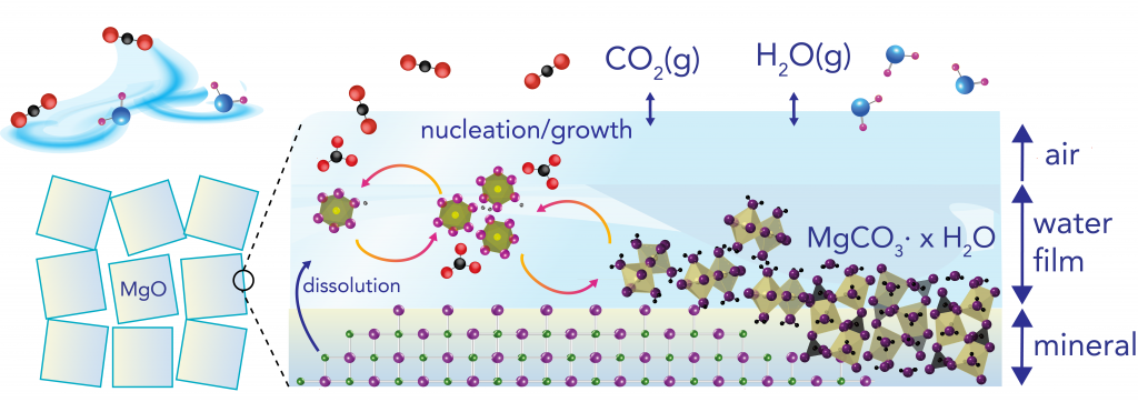 Mg-bearing mine wastes have a great potential of passively capturing atmospheric CO2 at low energetic costs, yet the reactions can be poisoned by impermeable Mg-carbonate nanocoatings. Using a proxy for Mg-bearing mine wastes, this experimental (vibrational spectroscopy, X-ray diffraction, X-ray photoelectron spectroscopy, electron microscopy) project will resolve molecular- to meso-scale processes of Mg-carbonate nucleation and growth during direct air capture. The focus on MgO nanocubes will directly benefit from the recent progress made by our group (Luong et al., 2023) on these materials. MgO is also a highly valuable proxy for Mg-bearing ultramafic minerals of mine wastes in CO2 mineralization research.